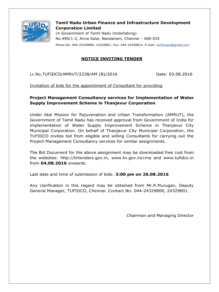 Tamil Nadu Urban Finance and Infrastructure Development Corporation Limited (A Government of Tamil Nadu Undertaking) No.490/12, Anna Salad, Bandana, Chennai 600 035 Phone No: 04424329800, 24329801.