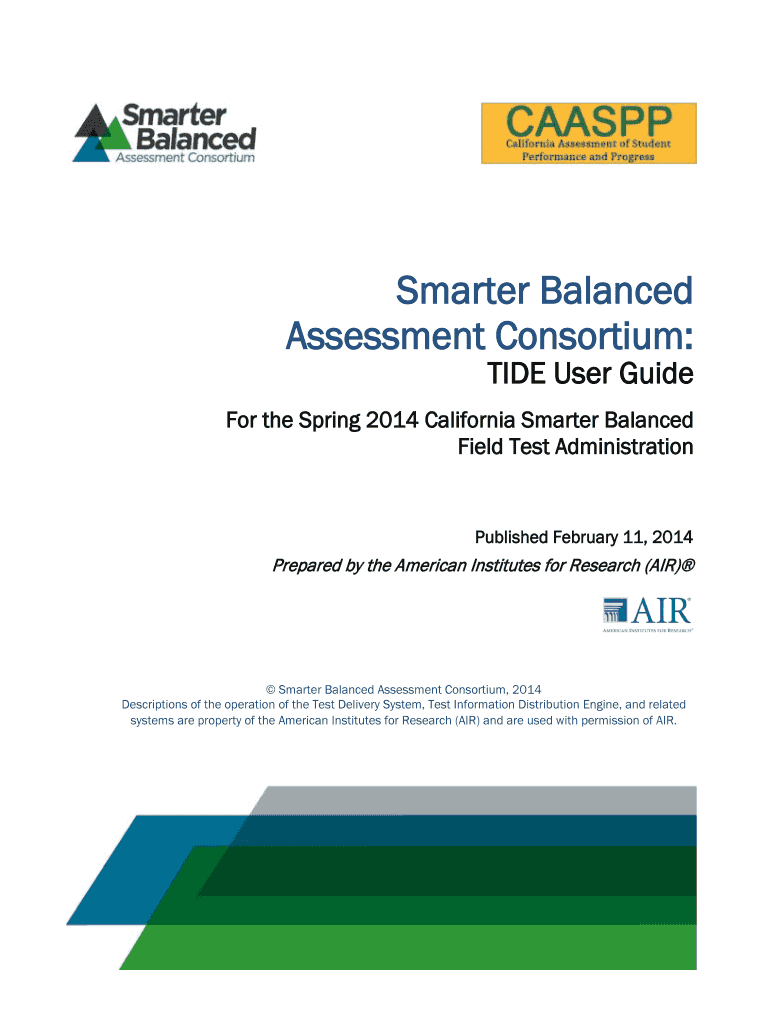 Smarter Balanced Assessment Consortium: TIDE User Guide For the Spring 2014 California Smarter Balanced Field Test Administration Published February 11, 2014, Prepared by the American Institutes for