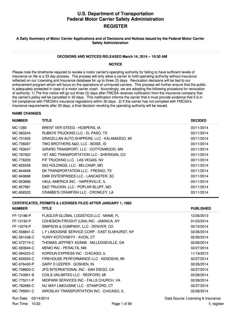 U.S. Department of Transportation Federal Motor Carrier Safety Administration Registers A Daily Summary of Motor Carrier Applications and of Decisions and Notices Issued by the Federal Motor Carrier