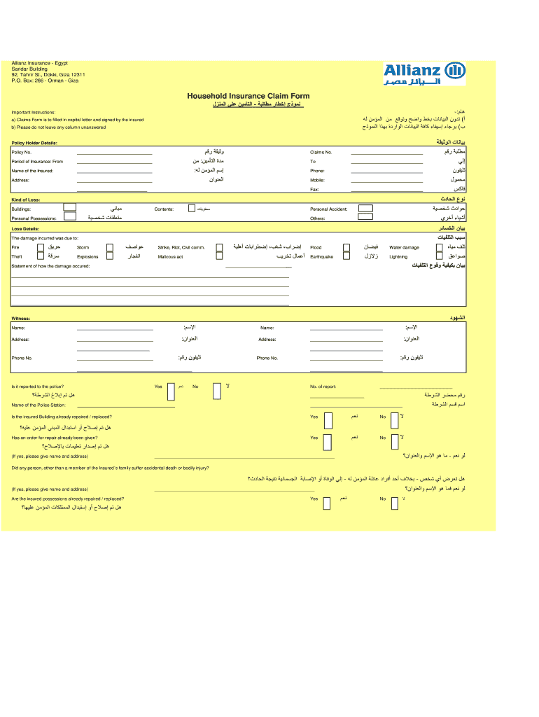 Allianz Insurance Egypt Sridhar Building 92, Their St., Dock, Giza 12311 P.O. Box: 266 Organ Giza Household Insurance Claim Form Important Instructions: a) Claims Form is too filled in capital letter