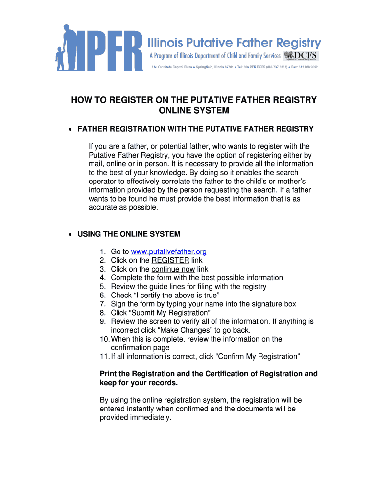 HOW TO REGISTER ON THE PUTATIVE FATHER REGISTRY ONLINE SYSTEM FATHER REGISTRATION WITH THE PUTATIVE FATHER REGISTRY If you are a father, or potential father, who wants to register with the Putative