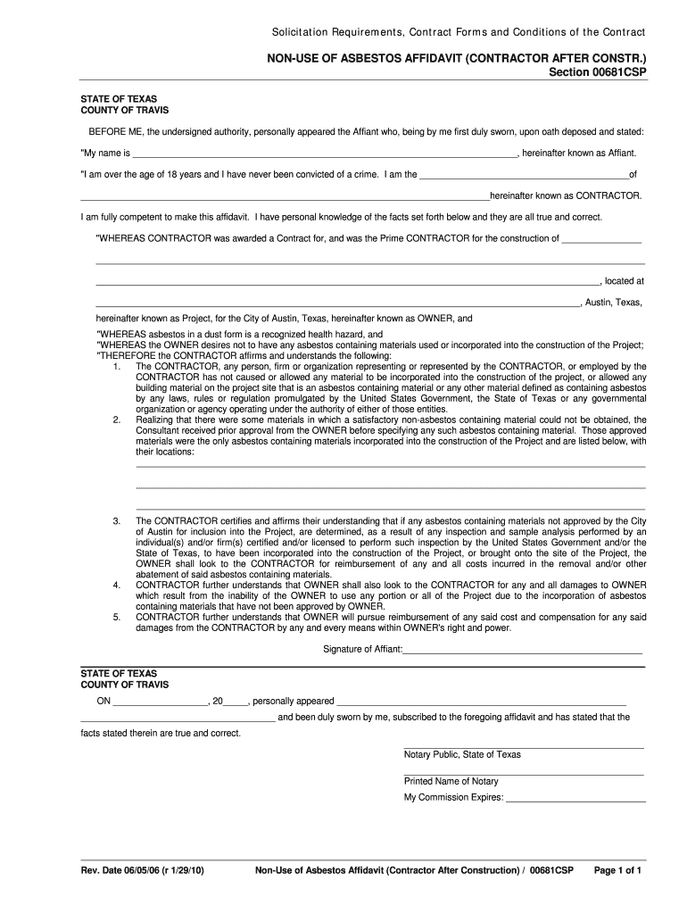 Get the free NON-USE OF ASBESTOS AFFIDAVIT (CONTRACTOR AFTER CONSTR ... - austintexas