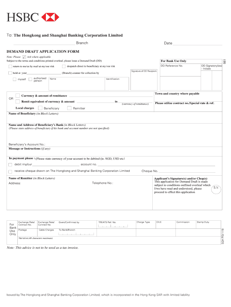 The Demand Draft Application Form is a financial document used by individuals and businesses to request the issuance of a demand draft from The Hongkong and Shanghai Banking Corporation Limited.