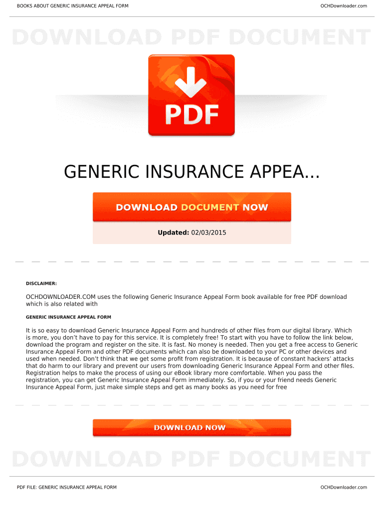 BOOKS ABOUT GENERIC INSURANCE APPEAL FORM OCHDownloader.com GENERIC INSURANCE APPEAR... Updated: 02/03/2015 DISCLAIMER: OCHDOWNLOADER.COM uses the following Generic Insurance Appeal Form book available