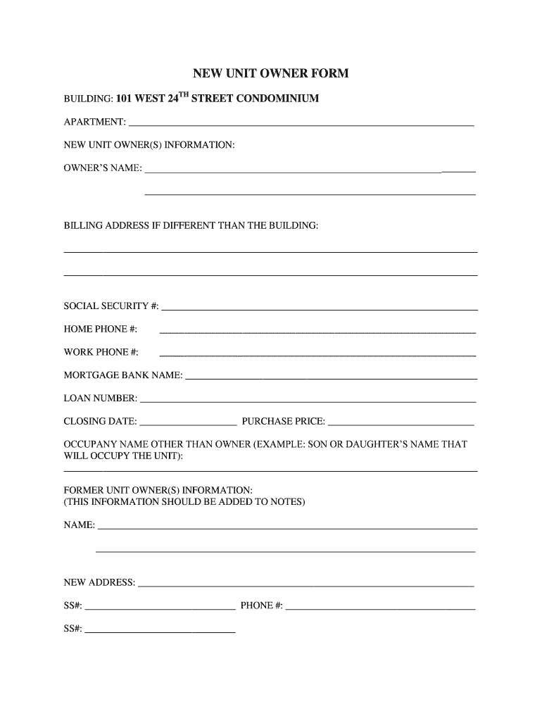 New unit owner form building: 101 west 24th street condominium apartment: new unit owner’s ...