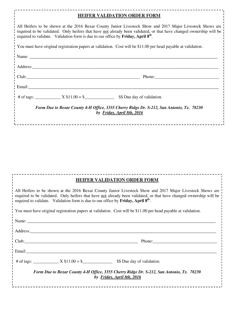 HEIFER VALIDATION ORDER FORM All Heifers to be shown at the 2016 Bexar County Junior Livestock Show and 2017 Major Livestock Shows are required to be validated.