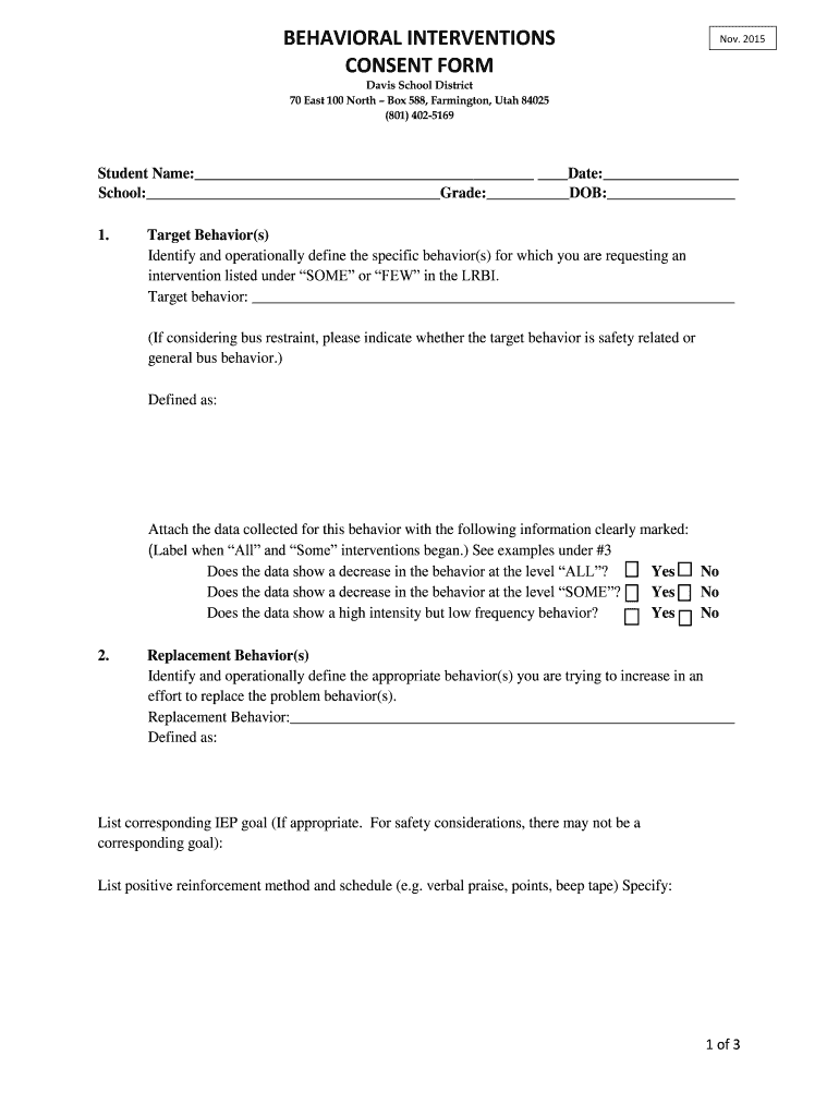 BEHAVIORAL INTERVENTIONS CONSENT FORM. Davis School District 70 East 100 North Box 588, Farmington, Utah 84025 (801) 402-5169. 2 of 3. Nov. 2015