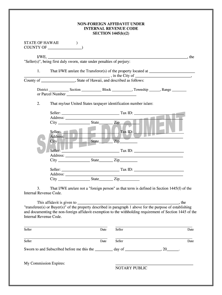 FOREIGN AFFIDAVIT UNDER INTERNAL REVENUE CODE SECTION 1445(b)(2) STATE OF HAWAII) COUNTY OF) I/WE, the “Seller(s) “, being first duly sworn, state under penalties of perjury: 1. That I/WE are/are