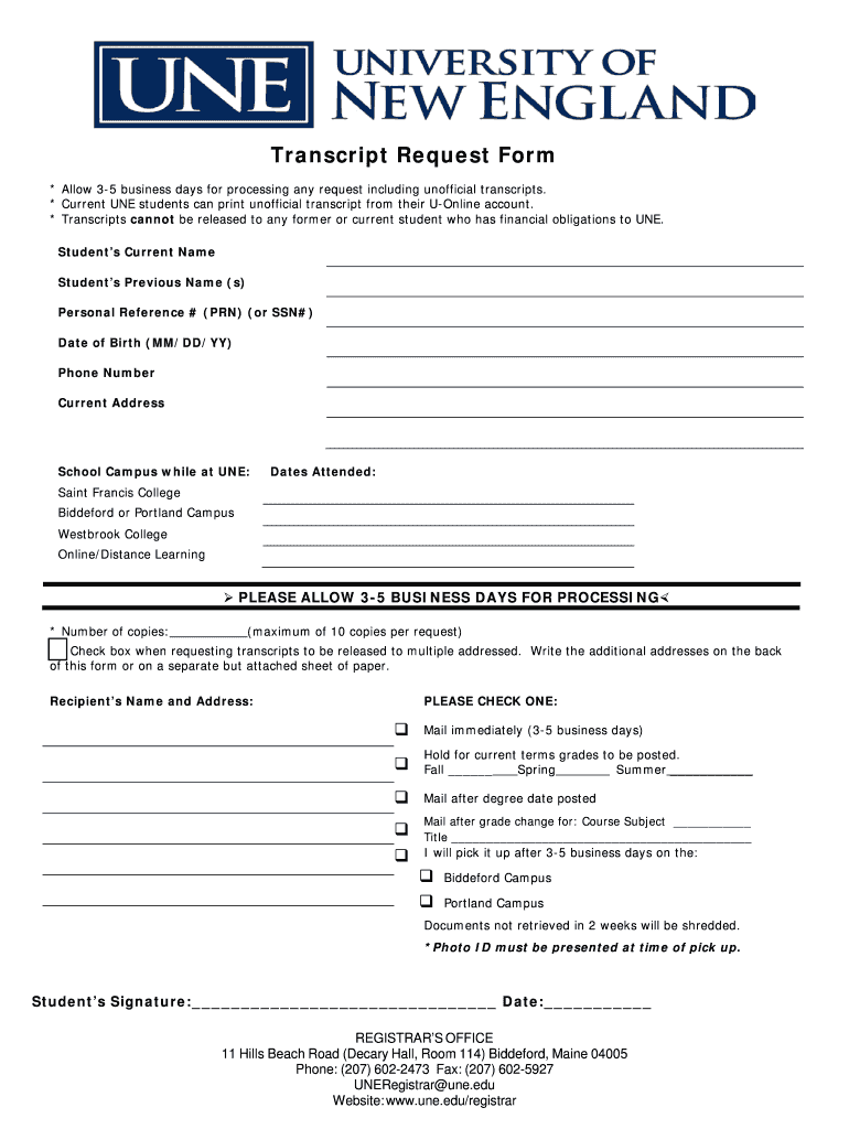 Get the free Transcript Request Form - University of New England - une