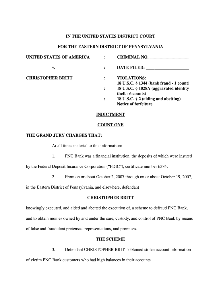 IN THE UNITED STATES DISTRICT COURT FOR THE EASTERN DISTRICT OF PENNSYLVANIA UNITED STATES OF AMERICA : : CHRISTOPHER BRITT DATE FILED: : v. CRIMINAL NO. VIOLATIONS: 18 U.S.C. 1344 (bank fraud 1 count)