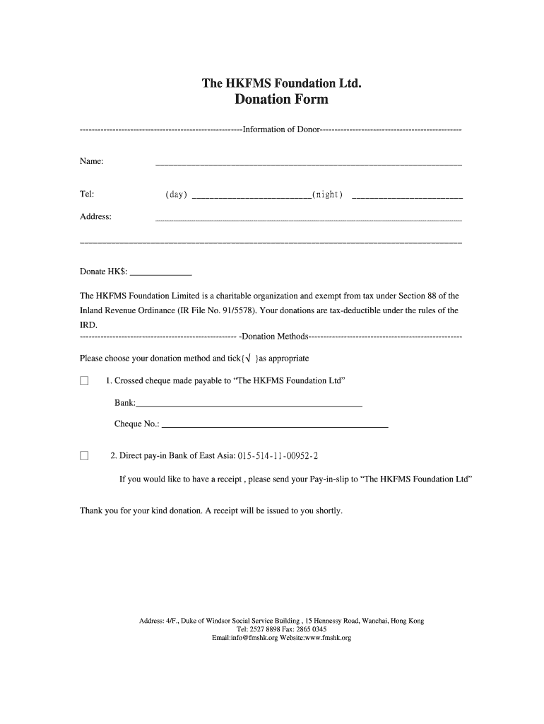 This form is necessary for processing donations and ensuring tax deductions for contributors. By utilizing the hkfms donation form, donors can streamline their charitable contributions and comply with tax regulations.