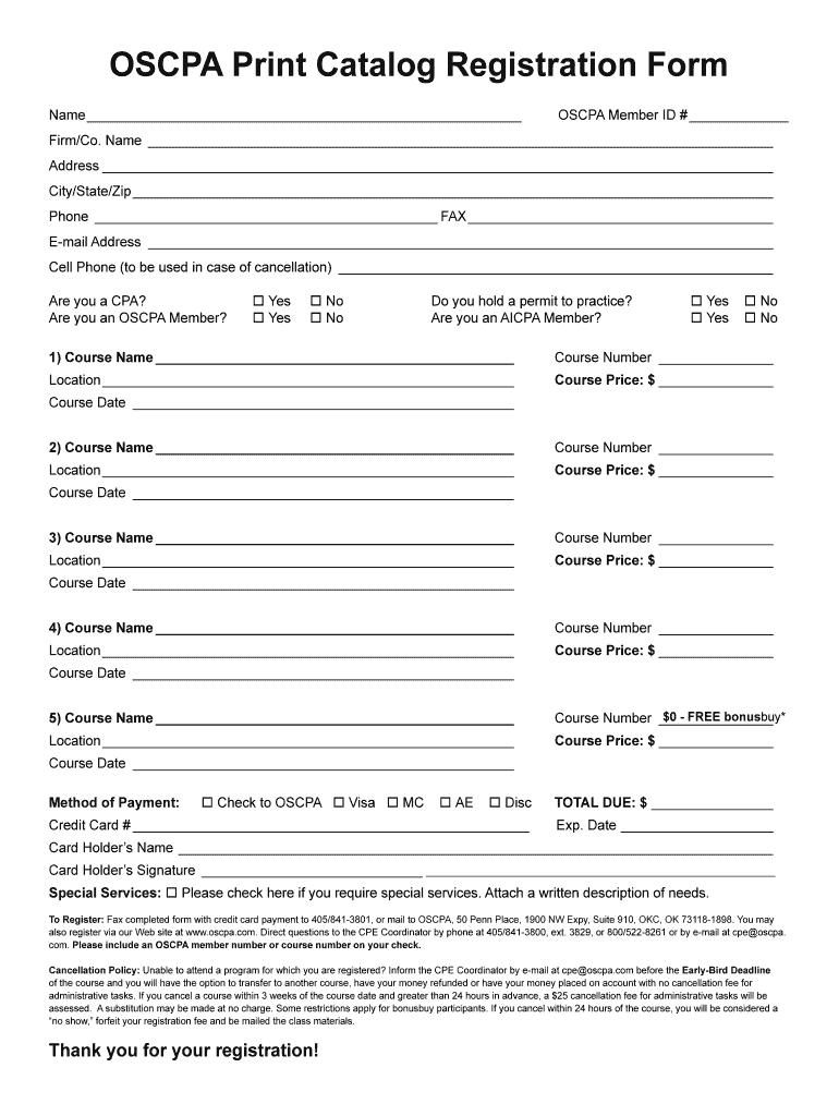 The OSCPA Print Catalog Registration Form allows registration for various accounting and finance courses provided by OSCPA. Specific course details are listed in the catalog.