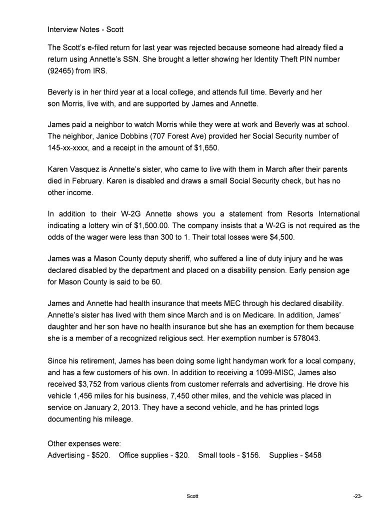 Interview Notes Scott The Scott's filed return for last year was rejected because someone had already filed a return using Annette's SSN. She brought a letter showing her Identity Theft PIN (92465)