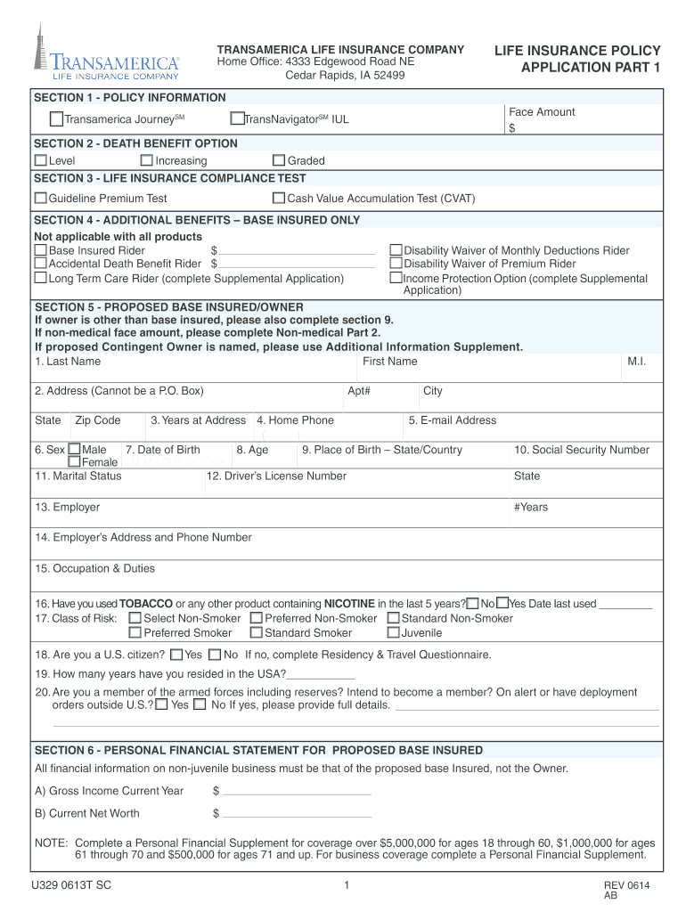 U329 0613T SC TRANSAMERICA LIFE INSURANCE COMPANY Home Office: 4333 Edgewood Road NE Cedar Rapids, IA 52499 LIFE INSURANCE POLICY APPLICATION PART 1