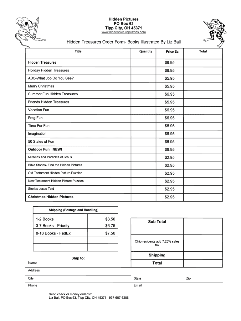 Hidden Pictures PO Box 63 TIPP City, OH 45371 www.hiddenpicturepuzzles.com Hidden Treasures Order Form Books Illustrated By Liz Ball Title Quantity Total Price Ea. Hidden Treasures $6.95 Holiday Hidden