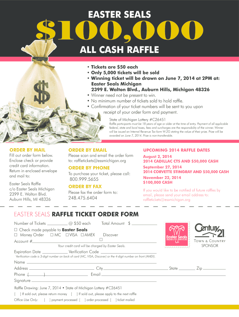 EASTER SEALS $100,000 ALL CASH RAFFLE Tickets are $50 each Only 5,000 tickets will be sold Winning ticket will be drawn on June 7, 2014, at 2PM at: Easter Seals Michigan 2399 E. Walton Blvd., Auburn