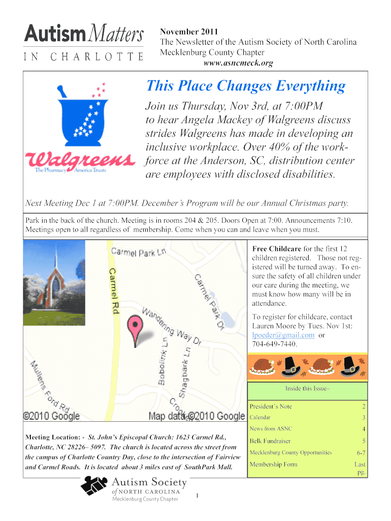 November 2011 The Newsletter of the Autism Society of North Carolina Mecklenburg County Chapter www.asncmeck.org This Place Changes Everything Join us Thursday, Nov 3rd, at 7:00PM to hear Angela Mickey