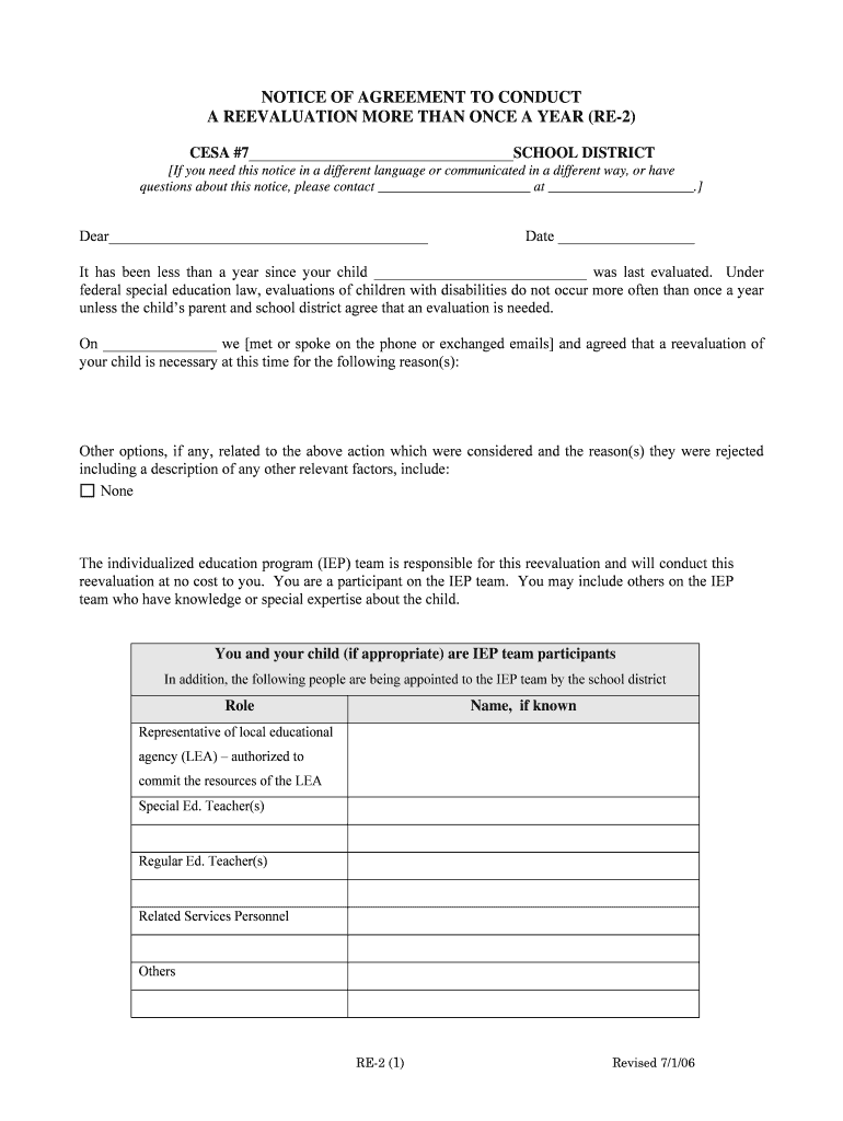 NOTICE OF AGREEMENT TO CONDUCT A REEVALUATION MORE THAN ONCE A YEAR (RE-2) CSA #7 SCHOOL DISTRICT If you need this notice in a different language or communicated differently, or have questions about