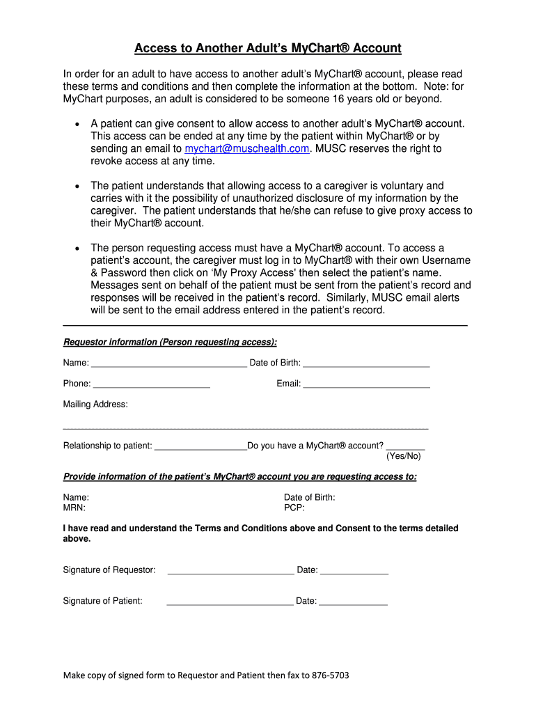 Access to Another Adults Chart Account In order for an adult to have access to another adults Chart account, please read these terms and conditions and then complete the information at the bottom.