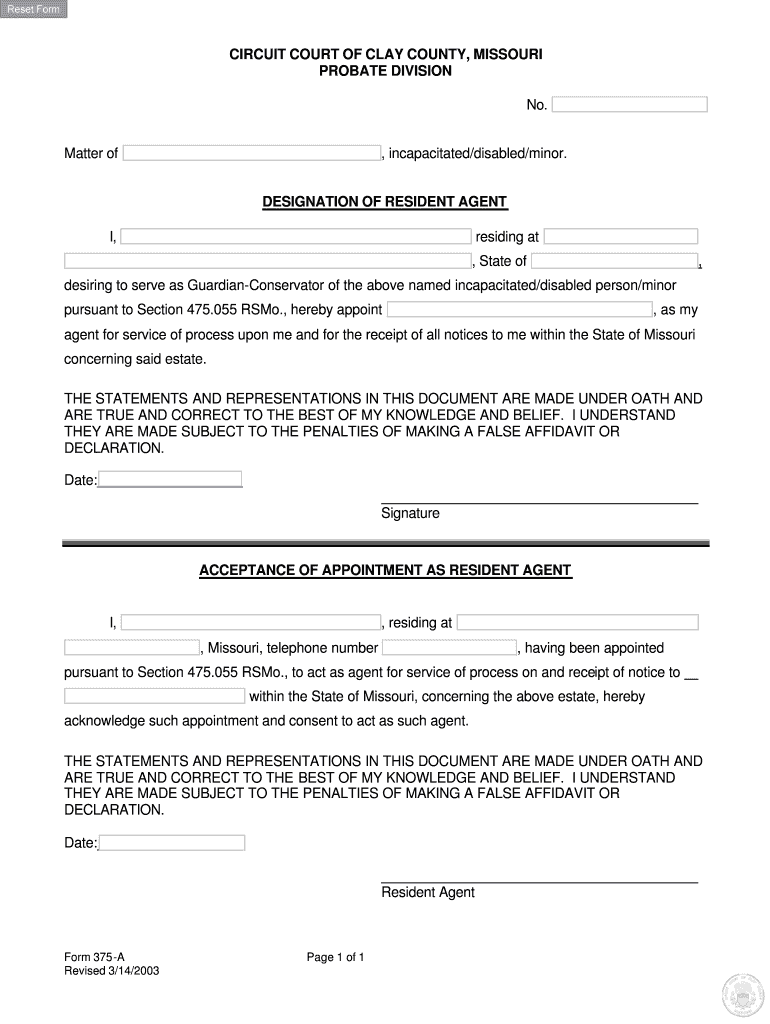 Title: Designation of Resident Agent Keywords: Circuit Court of Clay County, Missouri, Probate Division Created Date: 19990517004604Z