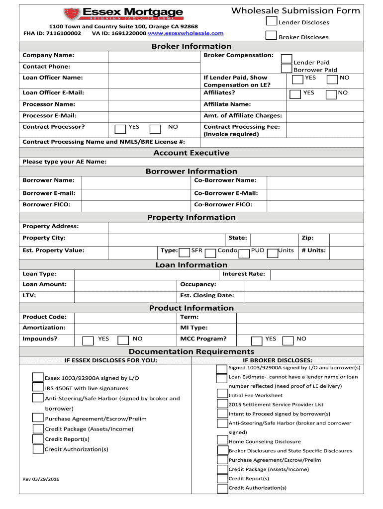 1100 Town and Country Suite 100, Orange CA 92868 FHA ID: 7116100002 VA ID: 1691220000 www.essexwholesale.com Wholesale Submission Form