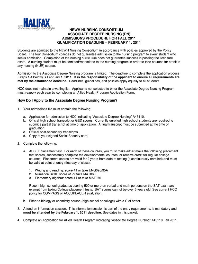 Get the free NEWH NURSING CONSORTIUM ASSOCIATE DEGREE NURSING (RN) ADMISSIONS PROCEDURE FOR FALL ...