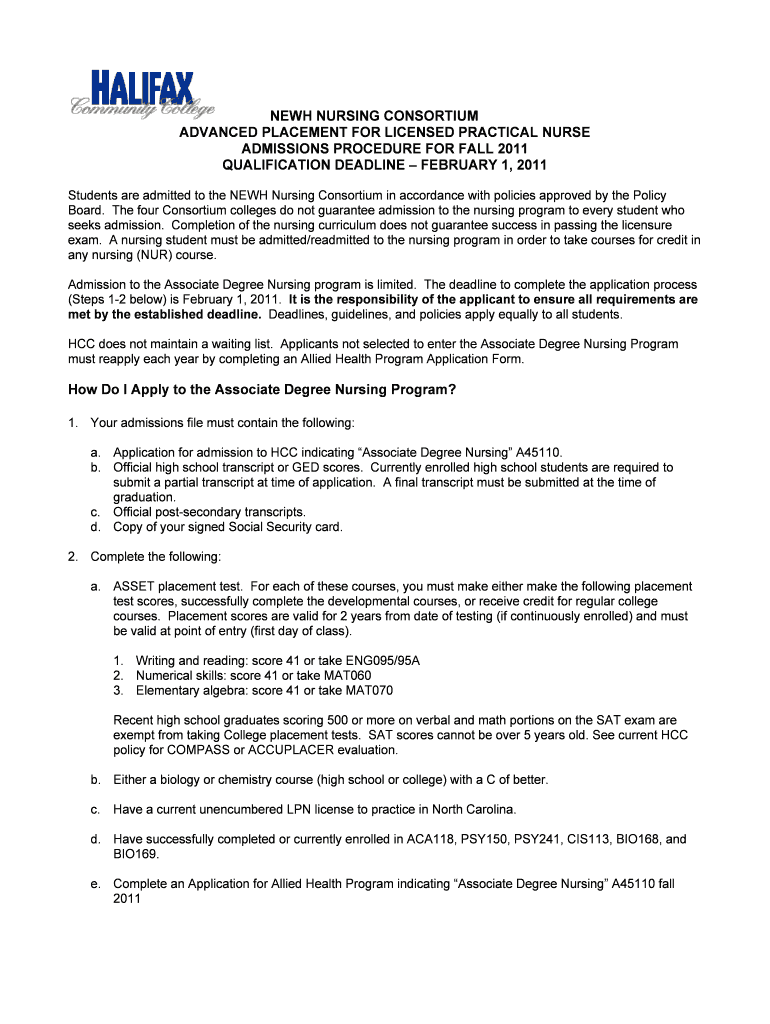 NEW NURSING CONSORTIUM ADVANCED PLACEMENT FOR LICENSED PRACTICAL NURSE ADMISSIONS PROCEDURE FOR FALL 2011 QUALIFICATION DEADLINE FEBRUARY 1, 2011, Students are admitted to the NEW Nursing Consortium