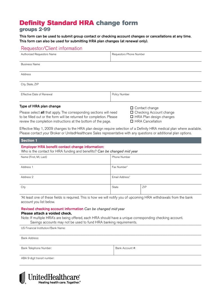 Definite Standard HRA change form groups 2-99 This form can be used to submit group contact or checking account changes or cancellations at any time. This form can also be used for submitting HRA