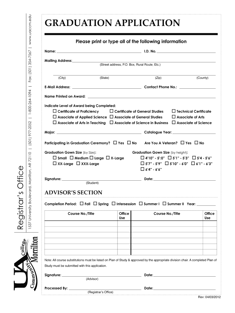 The Graduation Application Form is a document used by students to apply for graduation from a college or university.