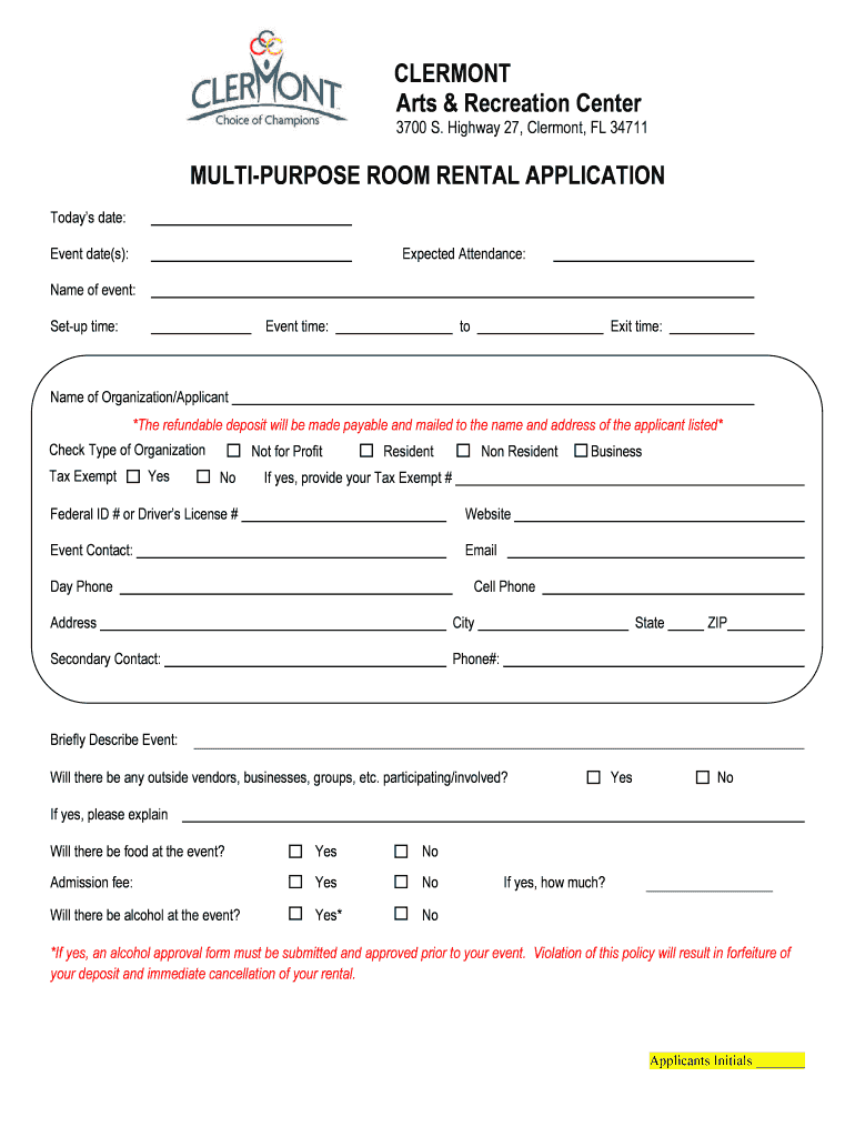 Applicant Initials CLERMONT Arts & Recreation Center 3700 S. Highway 27, Clermont, FL 34711 MULTI-PURPOSE ROOM RENTAL APPLICATION Today s date: