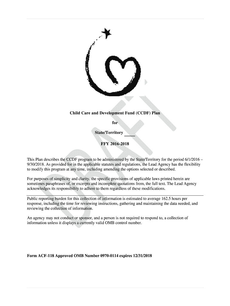 Child Care and Development Fund (CCD) Plan for State/Territory FLY 2016-2018 This Plan describes the CCD program to be administered by the State/Territory for the period 6/1/2016 9/30/2018. As provided