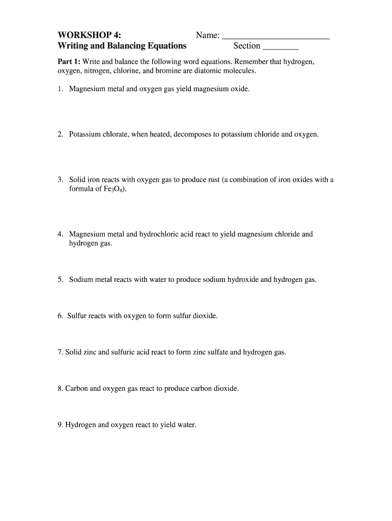 WORKSHOP 4: Writing and Balancing Equations Name: Section Part 1: Write and balance the following word equations. Remember that hydrogen, oxygen, nitrogen, chlorine, and bromine are diatomic molecules.