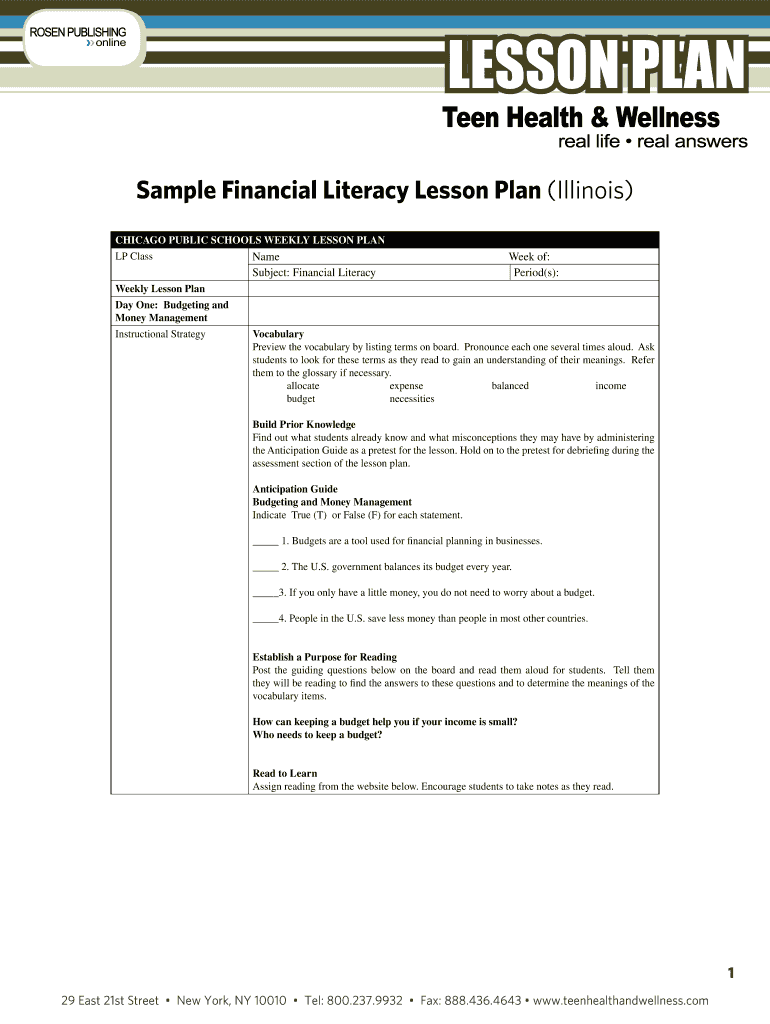 Lesson Plan Sample Financial Literacy Lesson Plan (Illinois) CHICAGO PUBLIC SCHOOLS WEEKLY LESSON PLAN LP Class Name Subject: Financial Literacy Week of: Period(s): Weekly Lesson Plan Day One: Budgeting