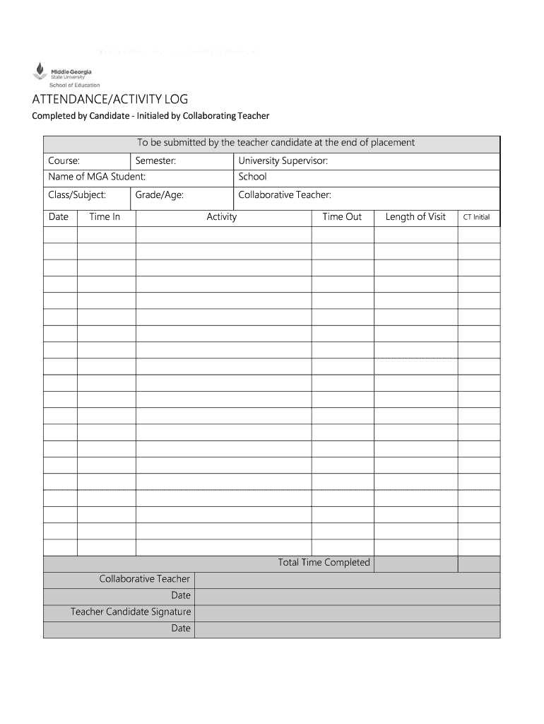 ATTENDANCE/ACTIVITY LOG Completed by Candidate ? Initialed by Collaborating Teacher To be submitted by the teacher candidate at the end of placement.