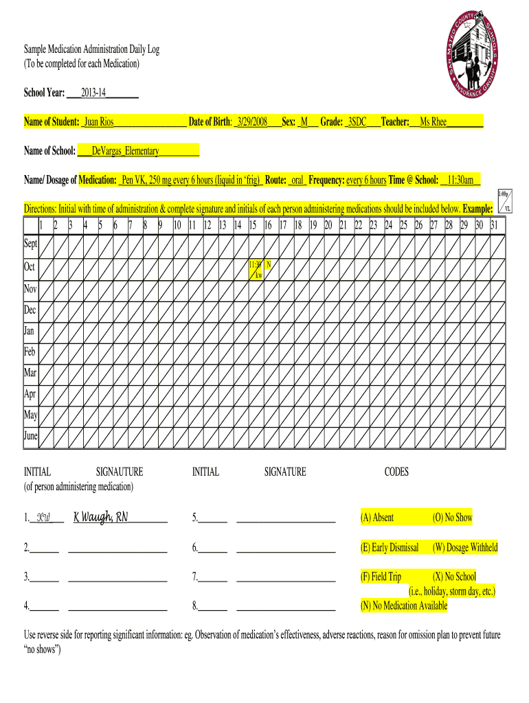 Sample Medication Administration Daily Log (To be completed for each Medication) School Year: 201314 Name of Student: Juan Rios Date of Birth: 3/29/2008 Sex: M Grade: 3SDC Teacher: Ms Rhee Name of
