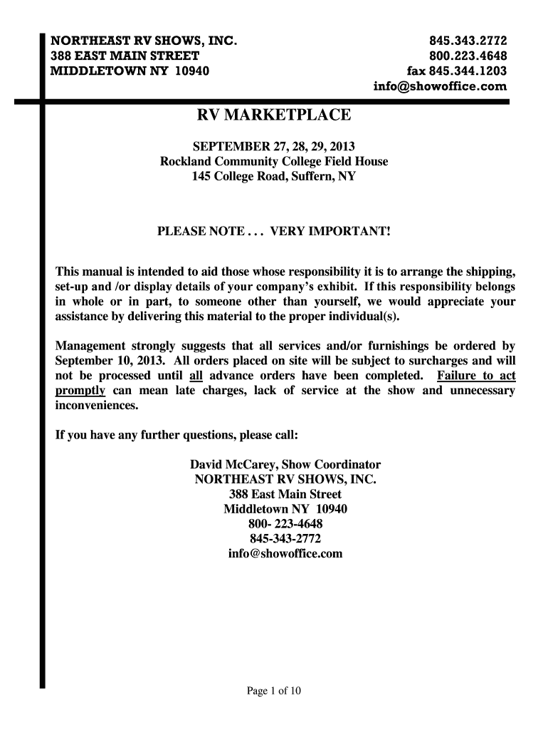 NORTHEAST RV SHOWS, INC. 388 EAST MAIN STREET MIDDLETOWN NY 10940 845.343.2772 800.223.4648 fax 845.344.1203 info showoffice.com RV MARKETPLACE SEPTEMBER 27, 28, 29, 2013 Rockland Community College