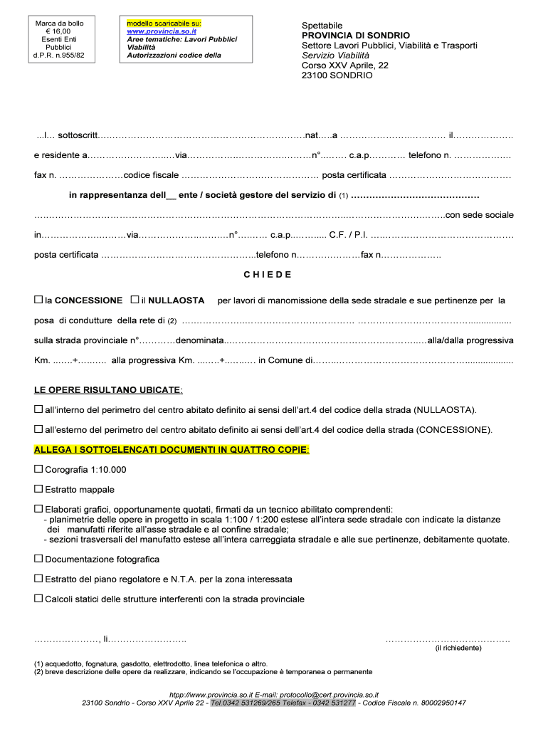 March the boll 16,00 Event Anti-Public d.P.R. n.955/82 model lo scaricabile SU: www.provincia.so.it Are rematch: Favor Public Viability Autorizzazioni codices Della Settable PROVINCIAL DI SONDRA Set
