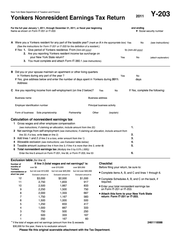 New York State Department of Taxation and Finance. Yonkers Nonresident Earnings Tax Return. Y-203. Name as shown on Form IT-201 or IT-203 Social security number.