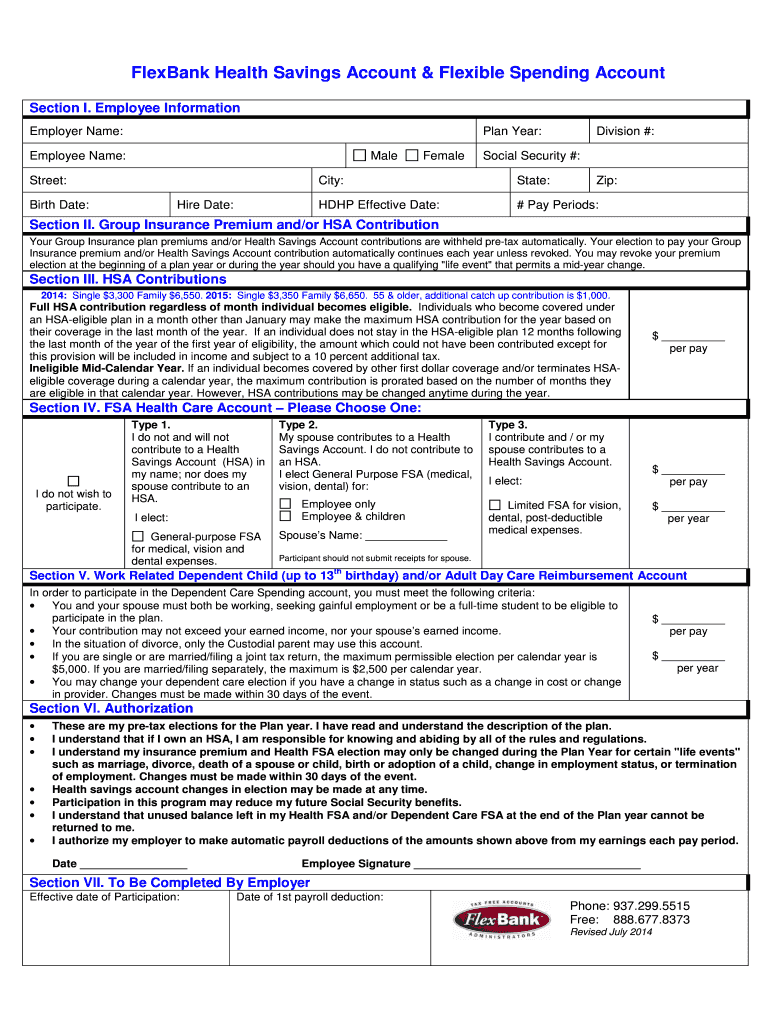 Health Savings Account & Flexible Spending Account Section I. Employee Information Employer Name: Plan Year: Employee Name: Male Street: Female Division #: Social Security #: City: Birth Date: DHP