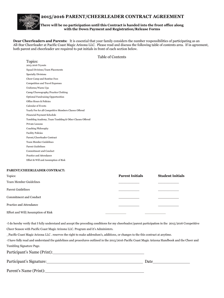 Get the free 2015-2016 PARENT / CHEERLEADER CONTRACT AGREEMENT