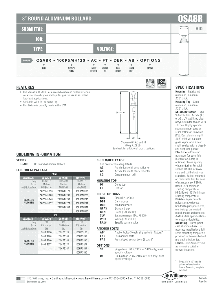 SPECIFICATIONS Housing Fabricated aluminum, minimum .125 thick. Housing Top Spun aluminum, minimum .125 thick. Shield/Reflector Type.