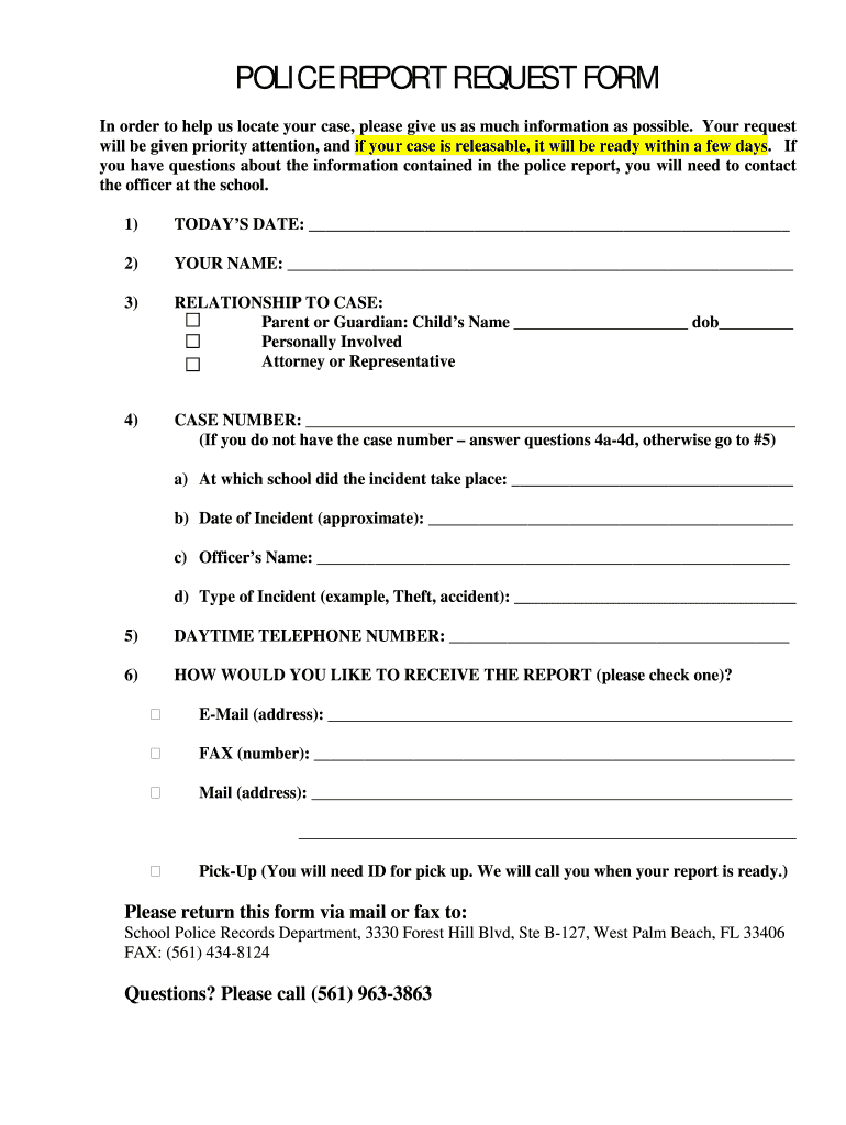 POLICE REPORT REQUEST FORM In order to help us locate your case, please give us as much information as possible. Your request will be given priority attention, and if your case is releasable, it will