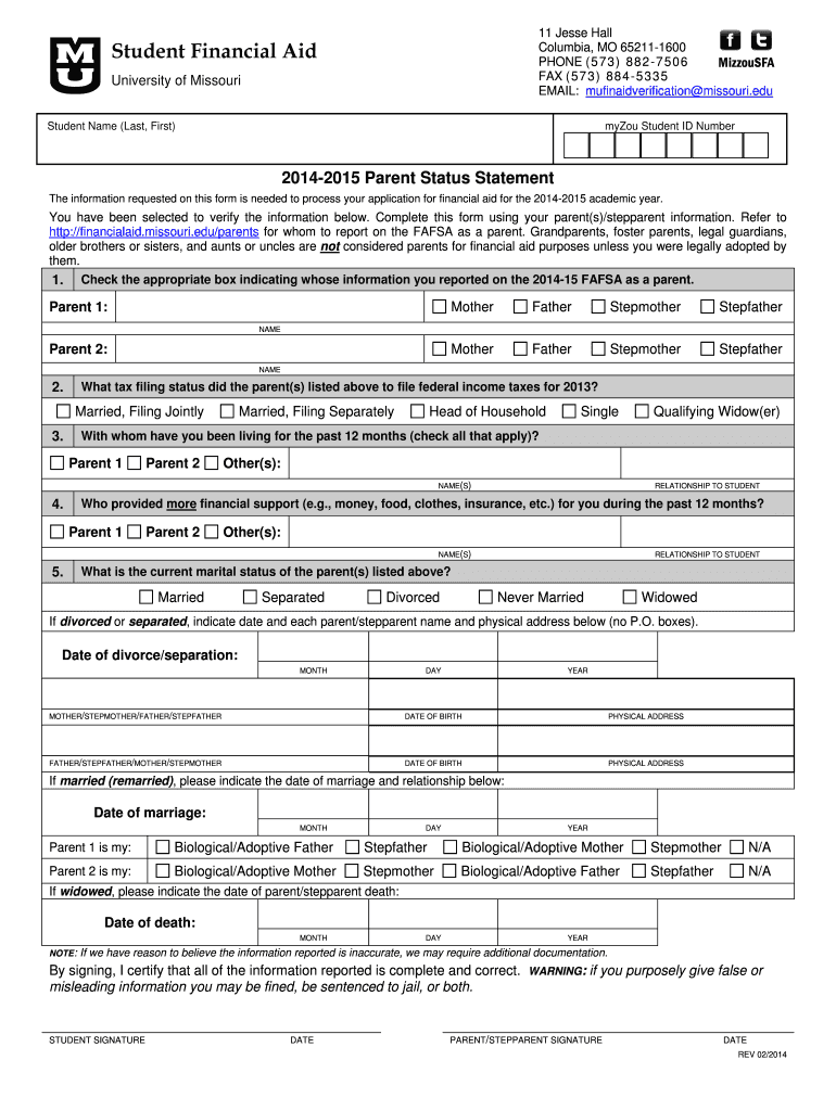 The Parent Status Statement must be completed by students applying for financial aid at the University of Missouri, along with their parents or stepparents who are required to provide their financial information.