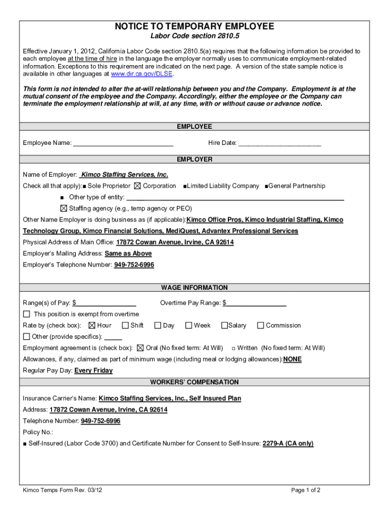 Get the free California Temporary Employee Notice