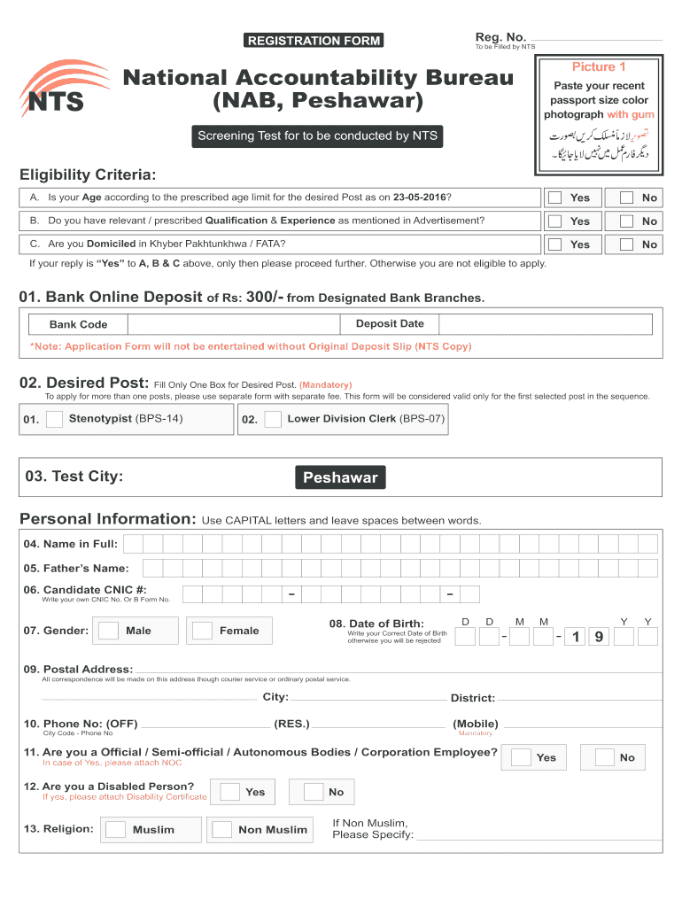 Reg. No. REGISTRATION FORM NTS To be Filled by NTS Picture 1 National Accountability Bureau (NAB, Peshawar) Paste your recent passport size color photograph with gum Screening Test for to be conducted