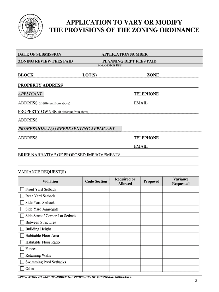 Get the free APPLICATION TO VARY OR MODIFY THE PROVISIONS OF THE ZONING ...