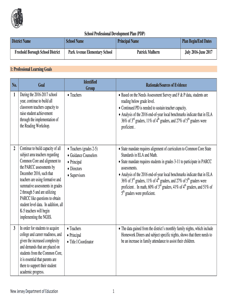 School Professional Development Plan (PDP) School Name Principal Name District Name Freehold Borough School District Park Avenue Elementary School Plan Begin/End Dates Patrick Muller July 2016June
