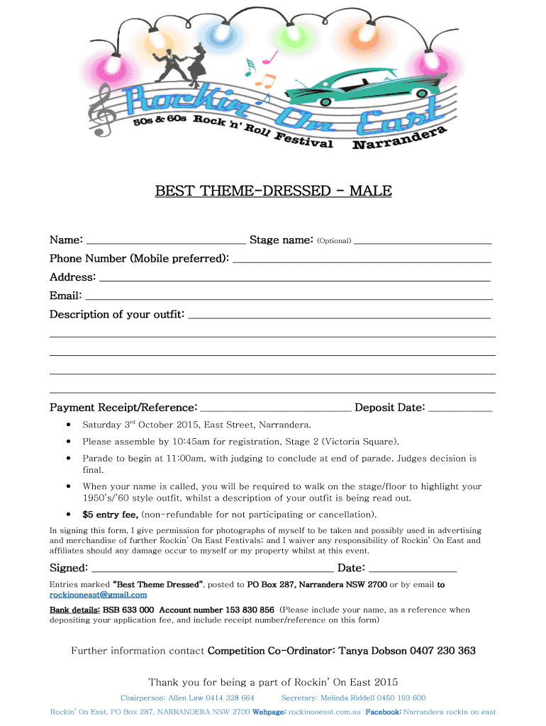 BEST THEMEDRESSED Filename: Stage name: (Optional) Phone Number (Mobile preferred): Address: Email: Description of your outfit: Payment Receipt/Reference: Deposit Date: rd Saturday 3October 2015,
