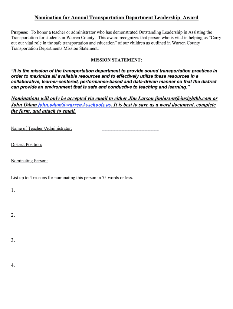 Get the free Nomination for Annual Transportation Department Leadership Awarddoc Energy Performan...