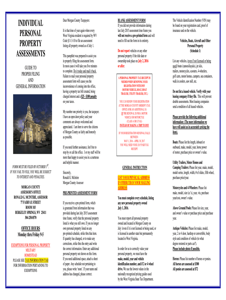 INDIVIDUAL PERSONAL PROPERTY ASSESSMENTS GUIDE TO PROPER FILING AND GENERAL INFORMATION Dear Morgan County Taxpayers: It is that time of year again when every West Virginia resident is required by